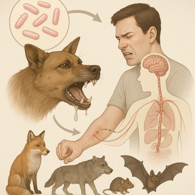 Вирус бешенства передается человеку через слюну больного животного, преимущественно при укусе, или при попадании слюны на поврежденную кожу или слизистые оболочки. Бешенство — 100% летальное заболевание после появления первых симптомов. Единственное спасение — экстренная медицинская помощь, оказанная до их развития.